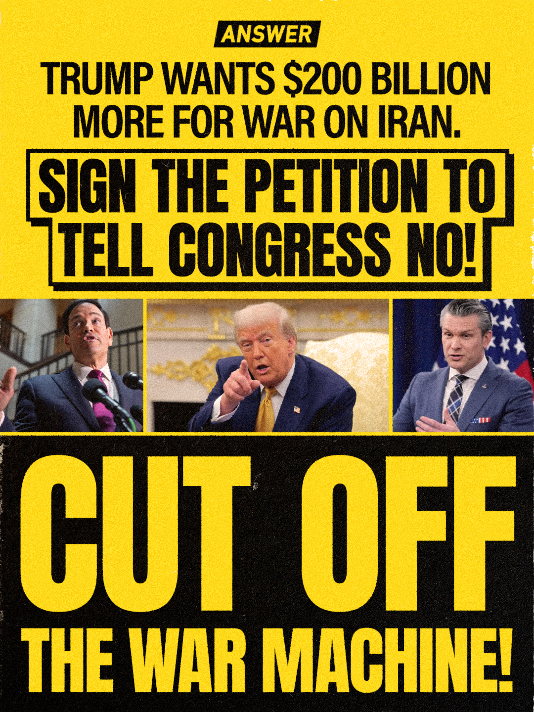 We demand that Congress reject the Trump administration’s request for a massive funding package to pay for its illegal war against Iran. Multiple media reports indicate that they are seeking as much as $200 billion. We do not want another cent of our tax money to go towards sustaining this aggression – Congress needs to use its power over the budget to cut off the war machine.